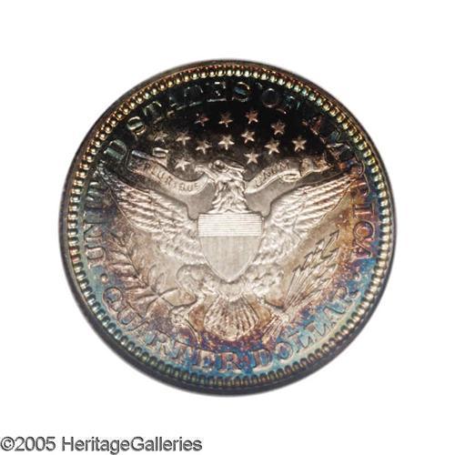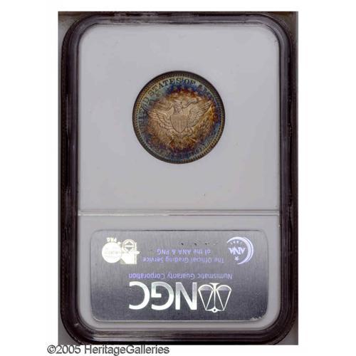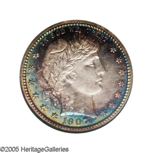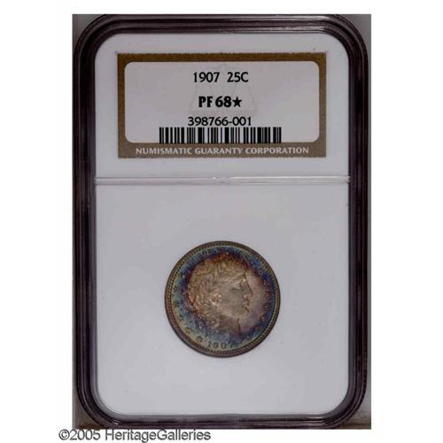 <B>1907<25C> PR68 <S NGC.</B></I> This date had a fairly low proof mintage of 575 pieces, with the certified population of business strikes higher than that of proofs. As the grade would suggest, this is a phenomenal and unequalled coin, both technically and aesthetically. The highly mirrored fields are lightly toned silver-gray in the centers, from which concentric rings radiate outward in shades of iridescent plum, indigo, aqua, yellow, and green. The NGC <I>Census Report</B></I> shows this to be highest and only example graded PR68 <S at that service (12/05).