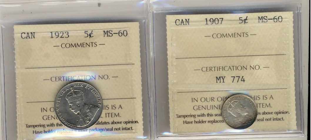 1907 5¢ & 1923 ICCS MS60. Lot of 2 coins.