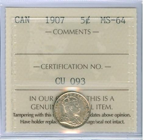 1907 5¢ ICCS MS64. Darkish purple and blue tone.