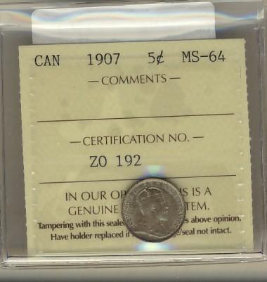 1907 5¢ ICCS MS64. Toned with great eye appeal.