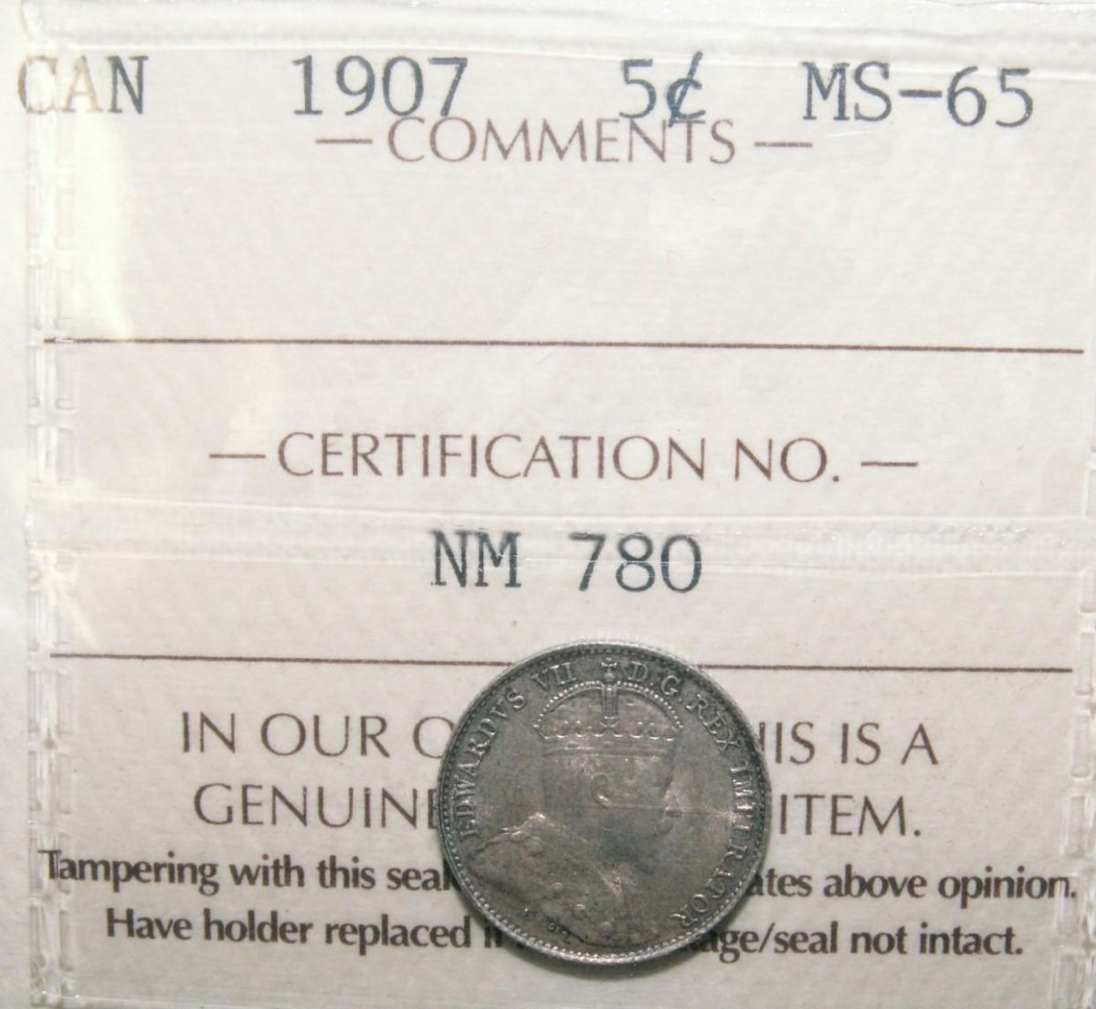 1907 5¢ ICCS MS65. Lovely struck example with attractive lustre and light golden brown tone.