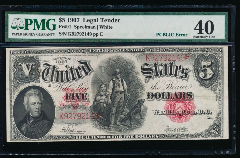 One 1907 $5 Large Legal Tender Note PMG 40.