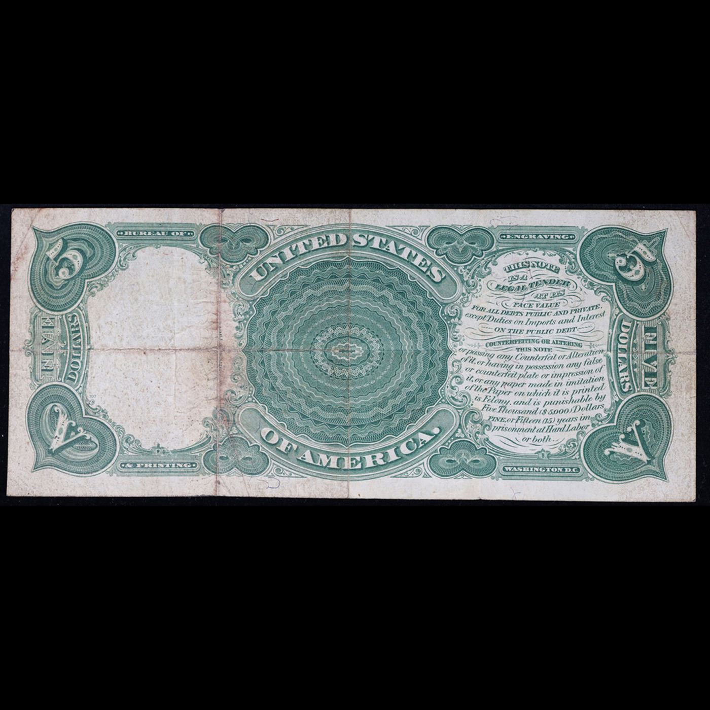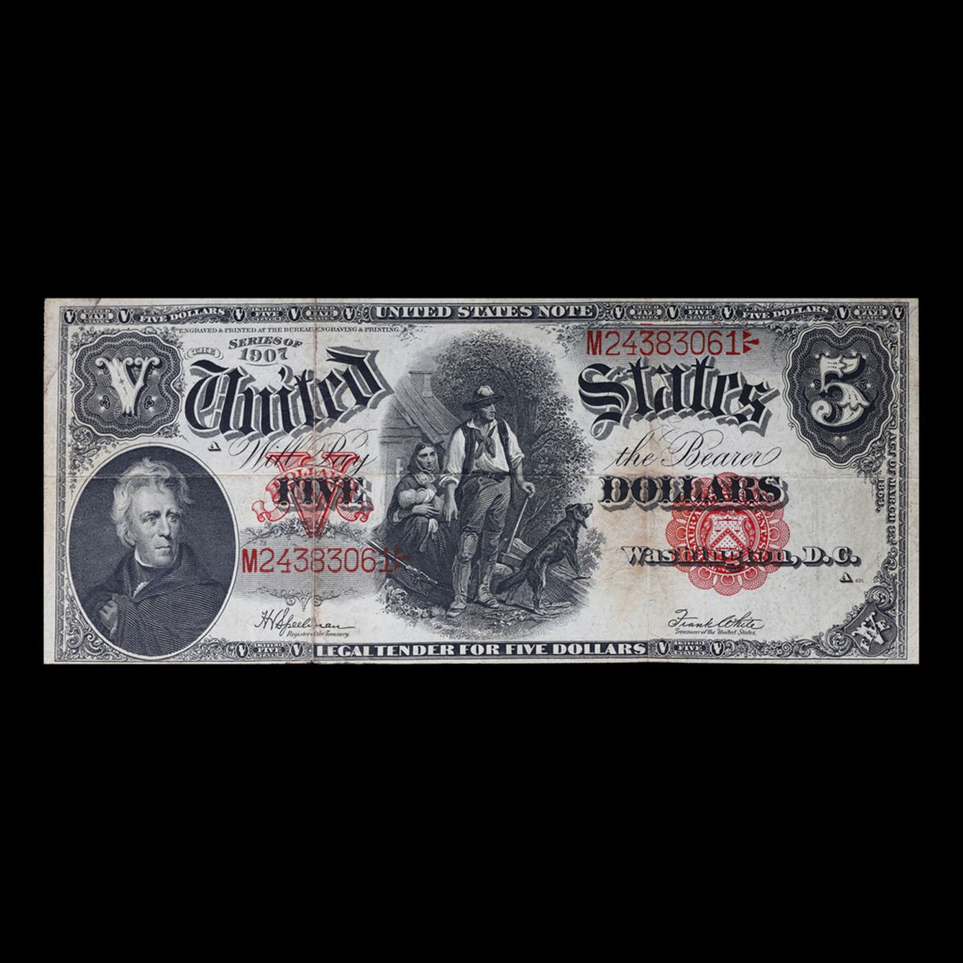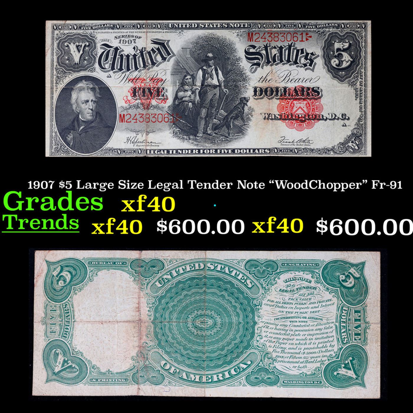 1907 $5 Large Size Legal Tender Note "WoodChopper" Fr-91 Grades xf. It is one of the most sought-after notes ever produced and now you can claim one for yourself! Nicknamed the "Woodchopper," the Series of 1907 $5 legal tender bill represents the last of the large size (or "horse-blanket" size) notes every issued in the United States. Bold red color defines the front of the coveted "Woodchopper" bill, across a Roman numeral "V," the treasury seal and the serial number. Then, what gives this $5 red treasury seal bill its namesake is a central portrait of a man with an axe, his dog, wife and child. The front also features a portrait of Andrew Jackson, which would later grace the $20 bill. Then, on the reverse side of this Andrew Jackson $5 bill is a central image design flanked by two ovals Fr# 91 SIgnatues Speelman-White