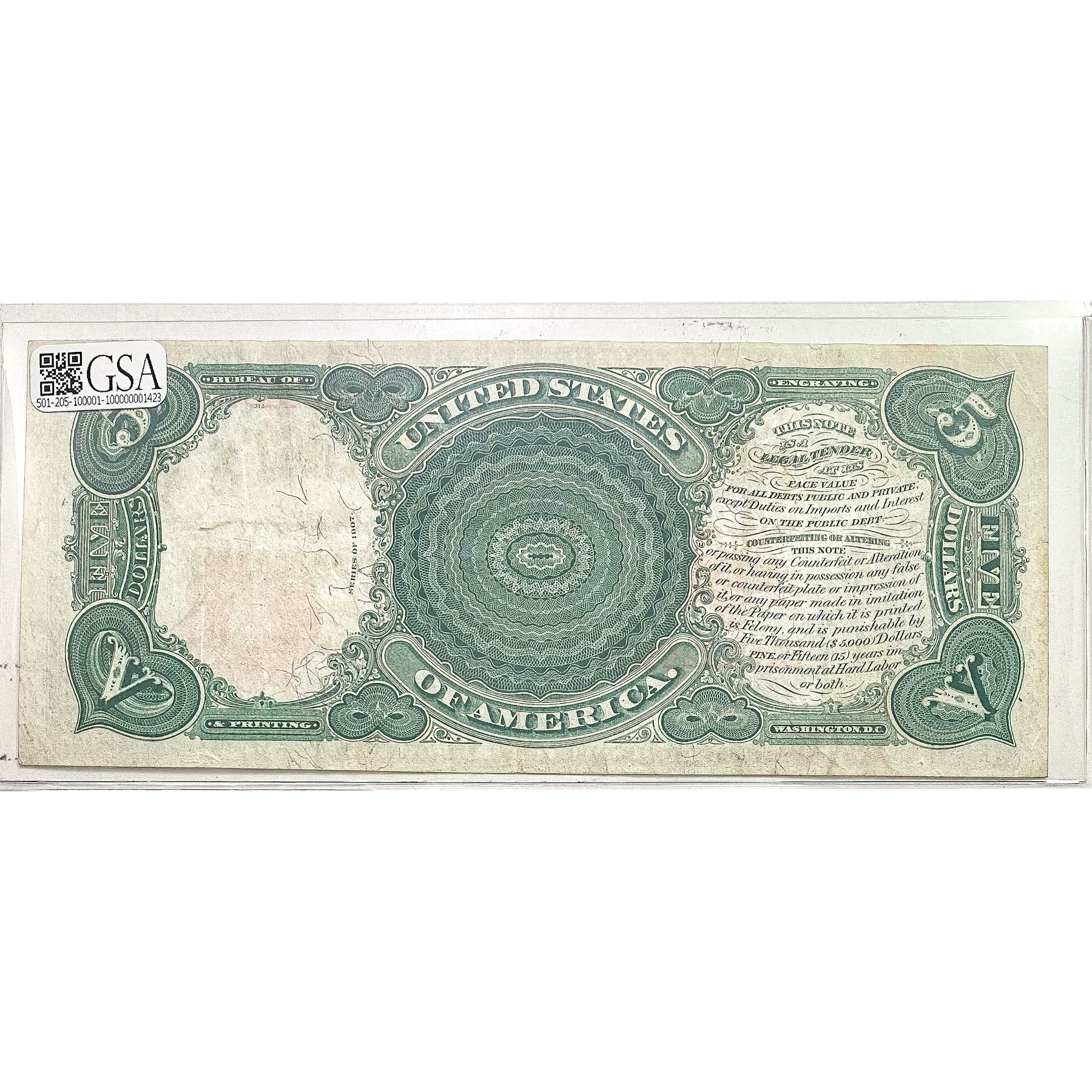 1907 $5 Large Size Legal Tender Note - Woodchopper
