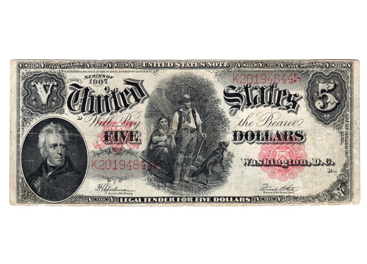 One 1907 $5 Large Size Woodchopper Legal Tender Note.