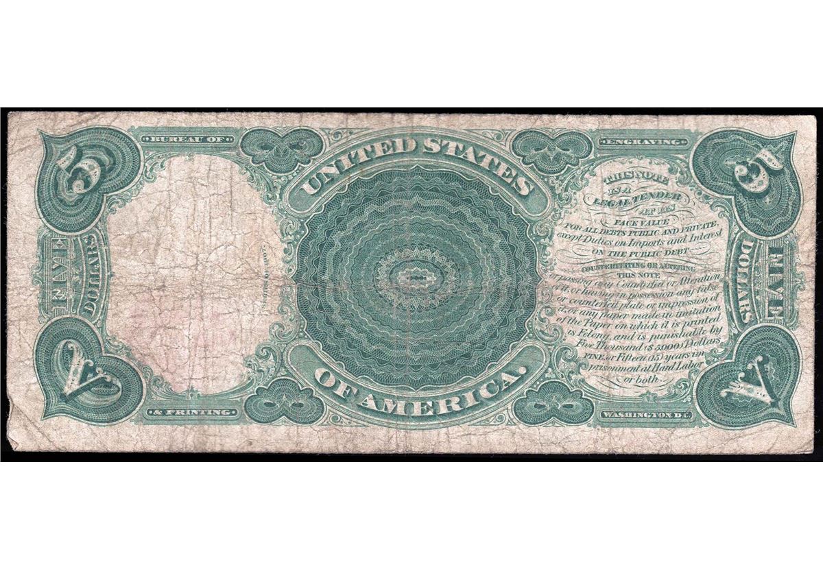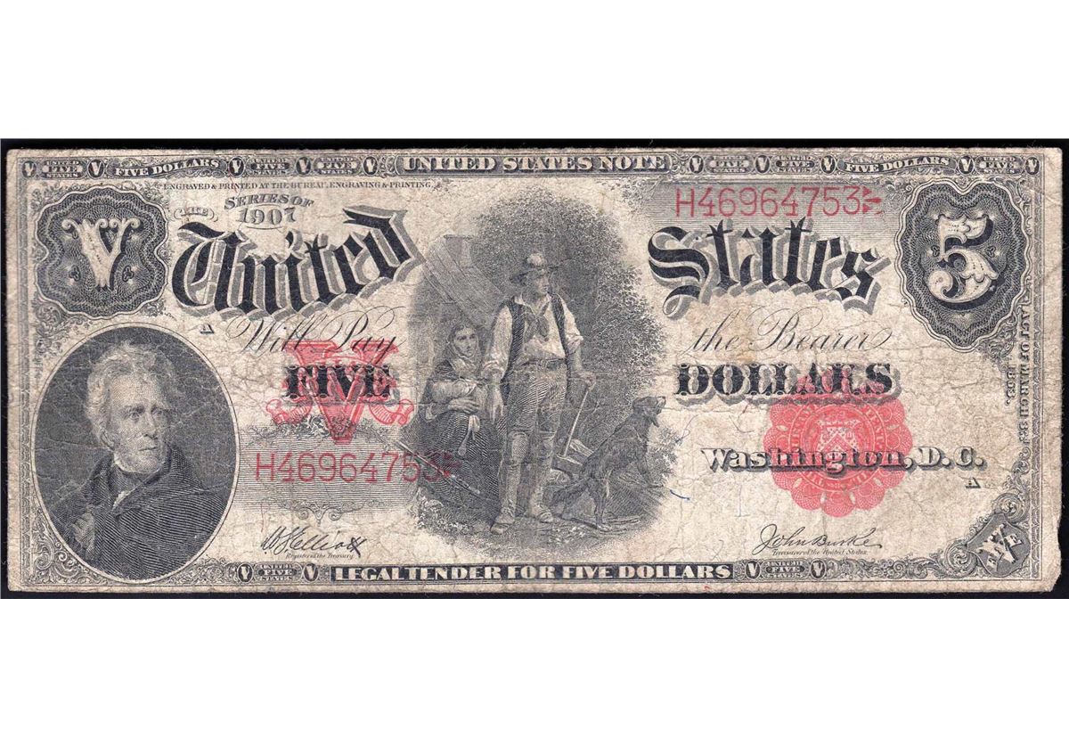 One 1907 $5 Large Size Woodchopper Legal Tender Note.