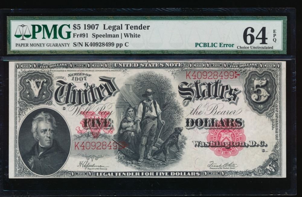 One 1907 $5 Legal Tender Note PCBLIC Error 64EPQ.
