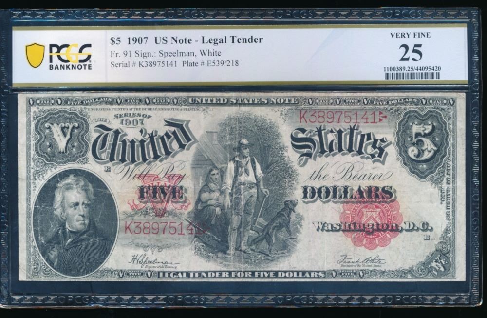 One 1907 $5 Legal Tender Note PCGS 25.