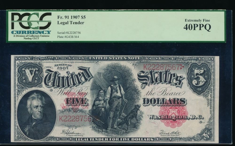 One 1907 $5 Legal Tender Note PCGS 40PPQ.