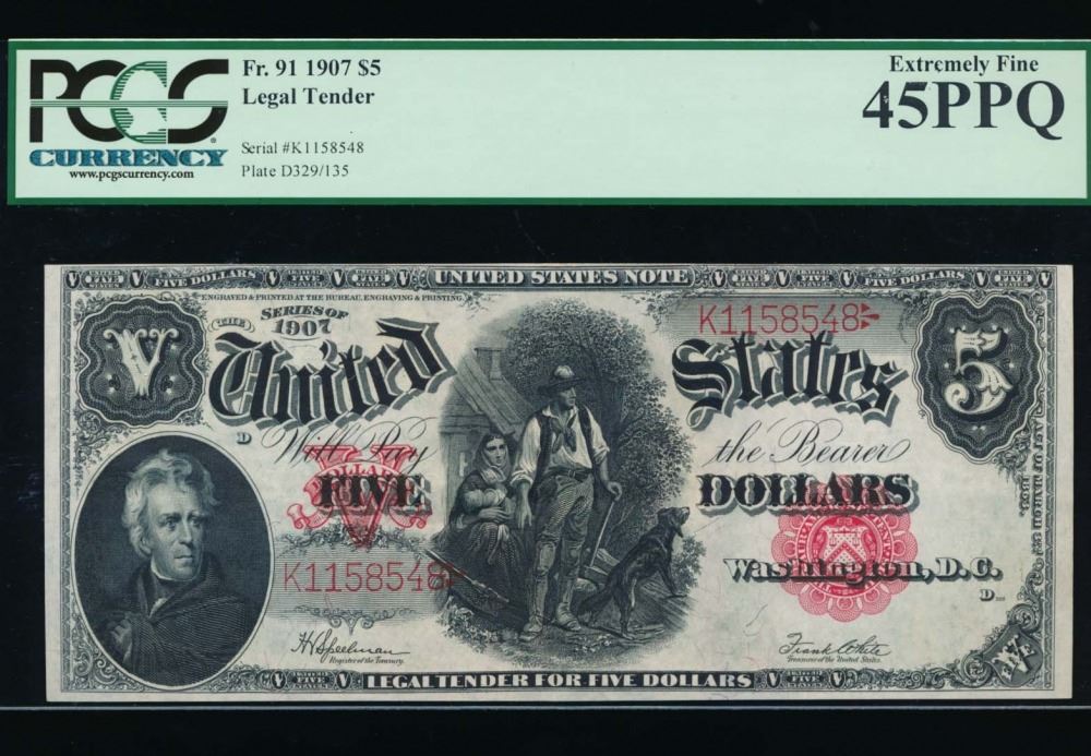 One 1907 $5 Legal Tender Note PCGS 45PPQ.
