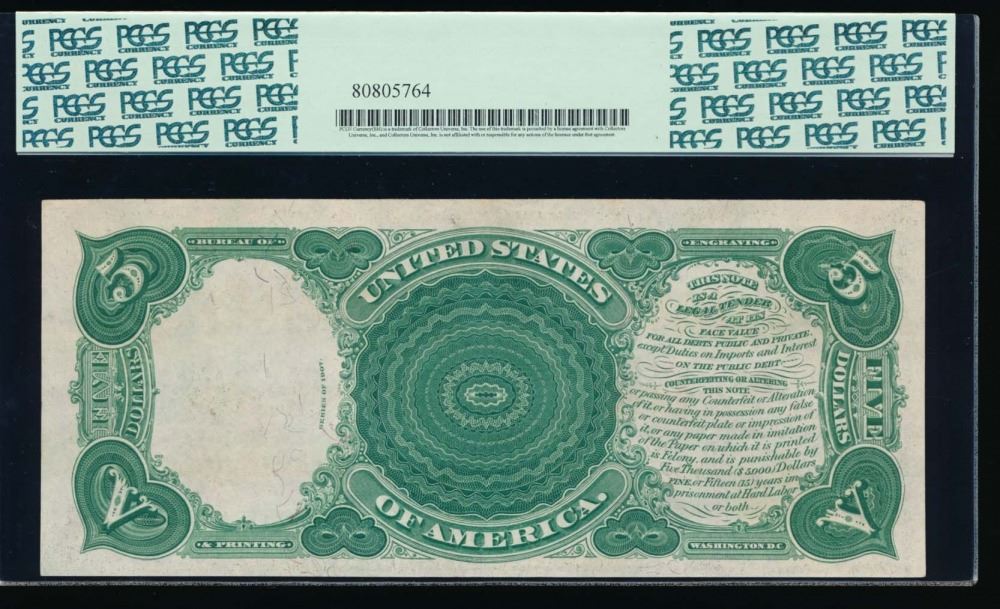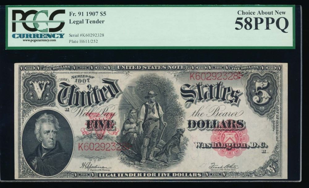 One 1907 $5 Legal Tender Note PCGS 58PPQ.