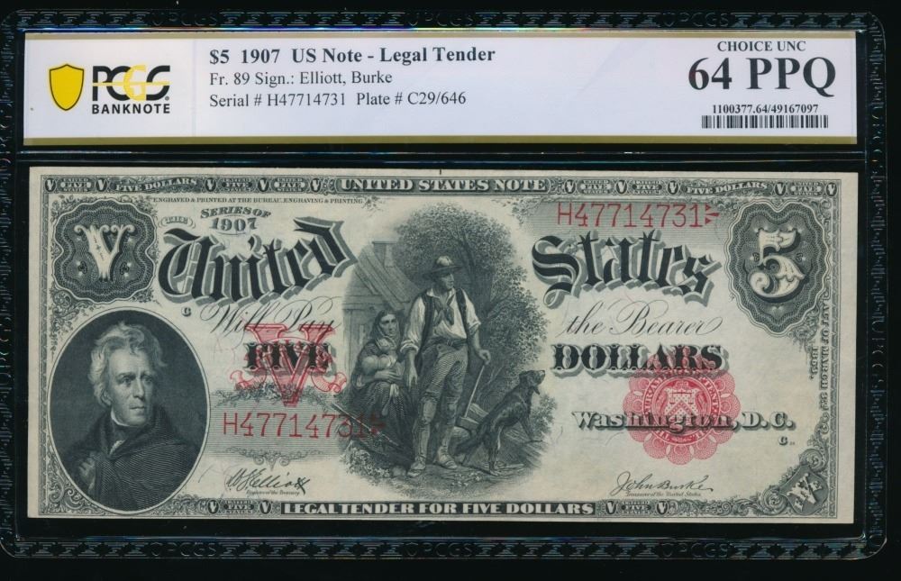One 1907 $5 Legal Tender Note PCGS 64PPQ.