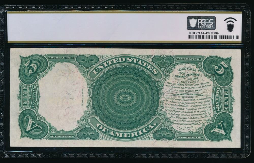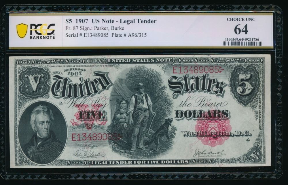 One 1907 $5 Legal Tender Note PCGS 64.