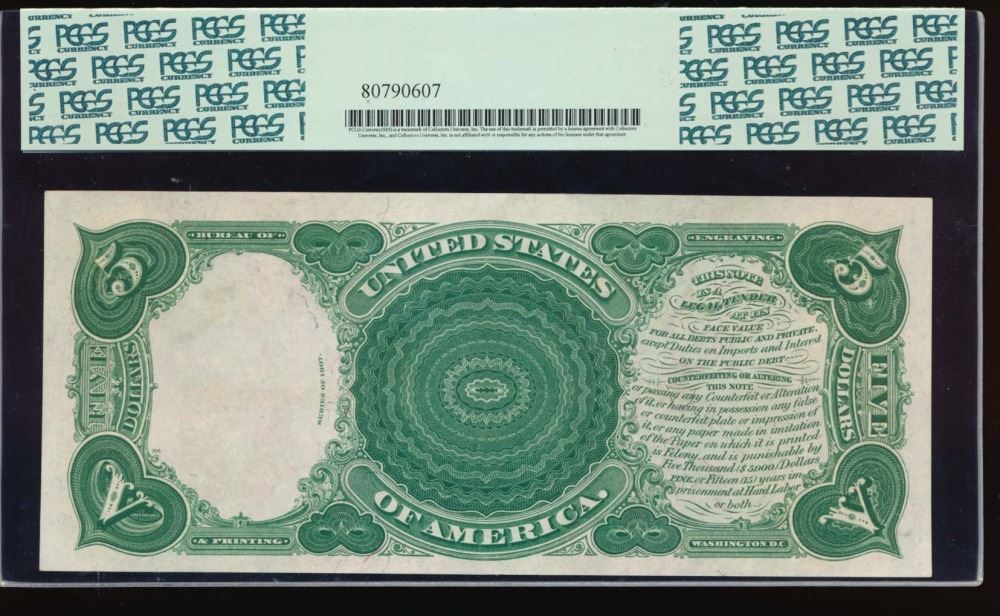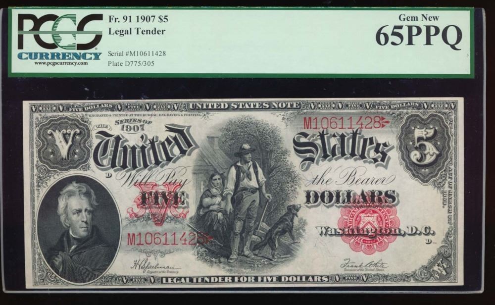 One 1907 $5 Legal Tender Note PCGS 65PPQ.