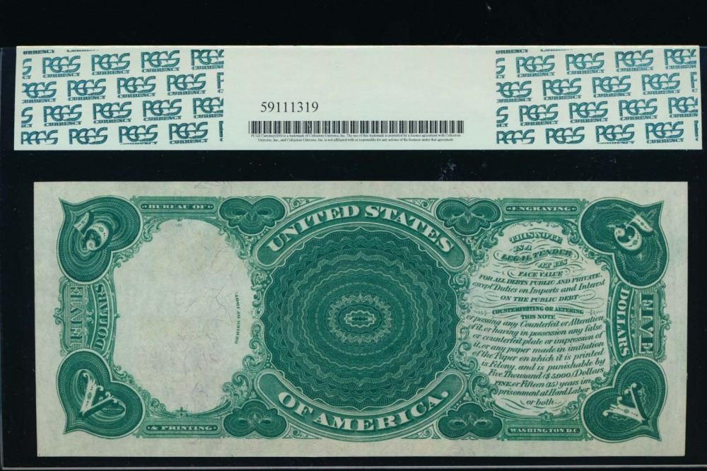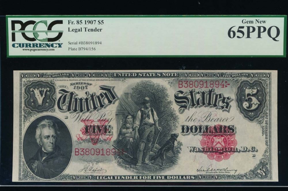 One 1907 $5 Legal Tender Note PCGS 65PPQ.