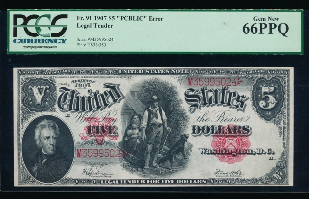 One 1907 $5 Legal Tender Note PCGS 66PPQ.