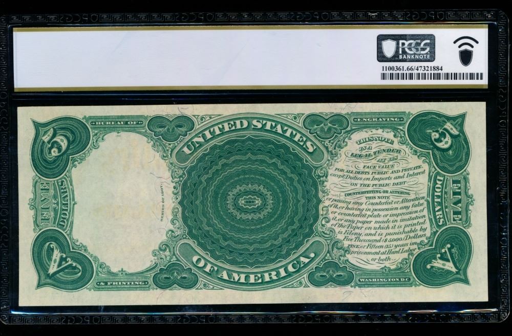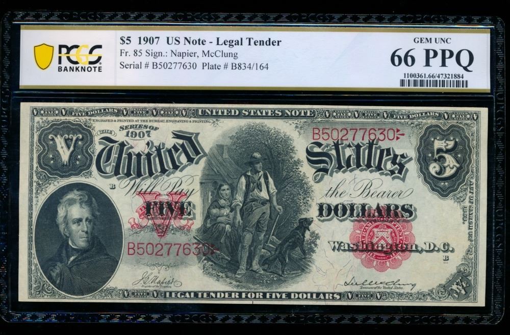 One 1907 $5 Legal Tender Note PCGS 66PPQ.