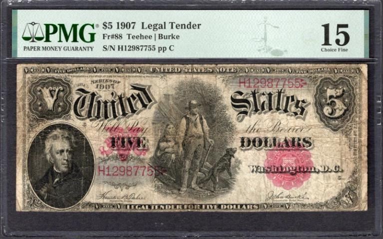 One 1907 $5 Legal Tender Note PMG 15.