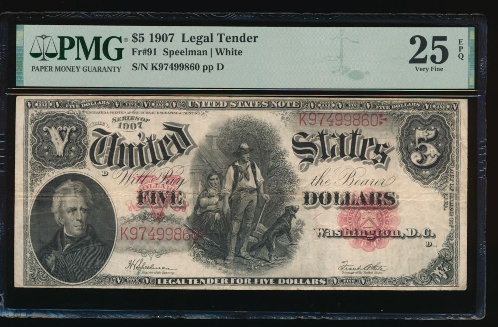 One 1907 $5 Legal Tender Note PMG 25EPQ.