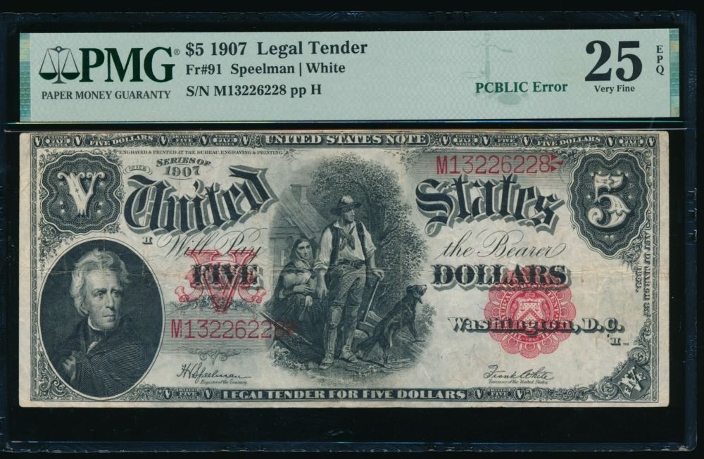 One 1907 $5 Legal Tender Note PMG 25EPQ.