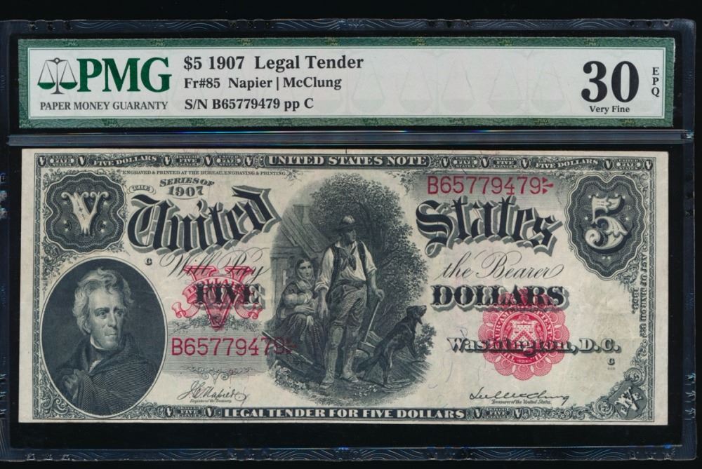 One 1907 $5 Legal Tender Note PMG 30EPQ.