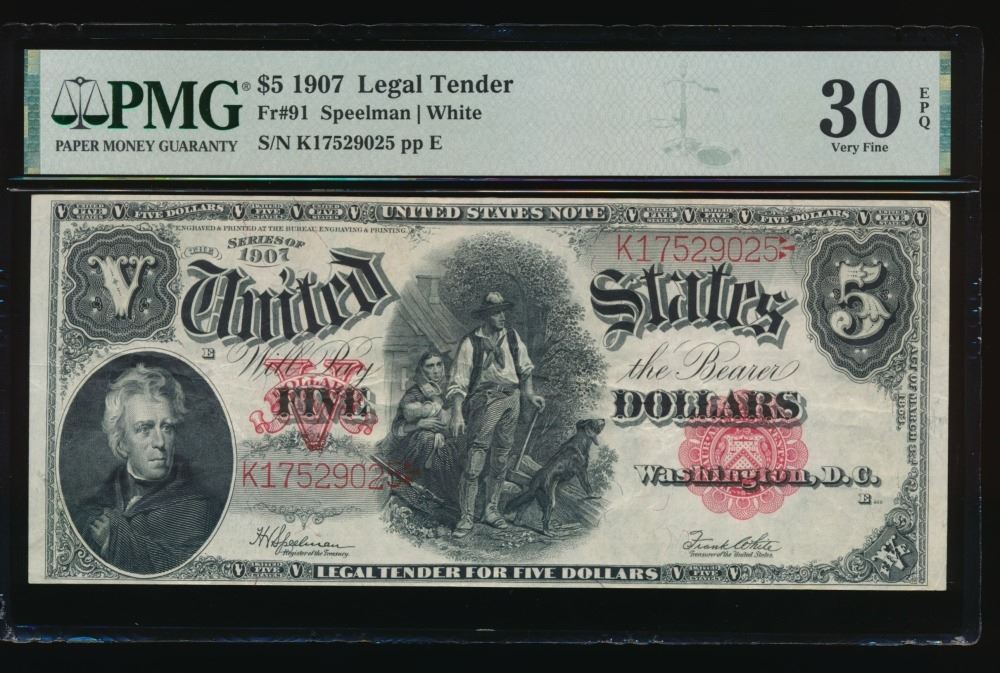 One 1907 $5 Legal Tender Note PMG 30EPQ.