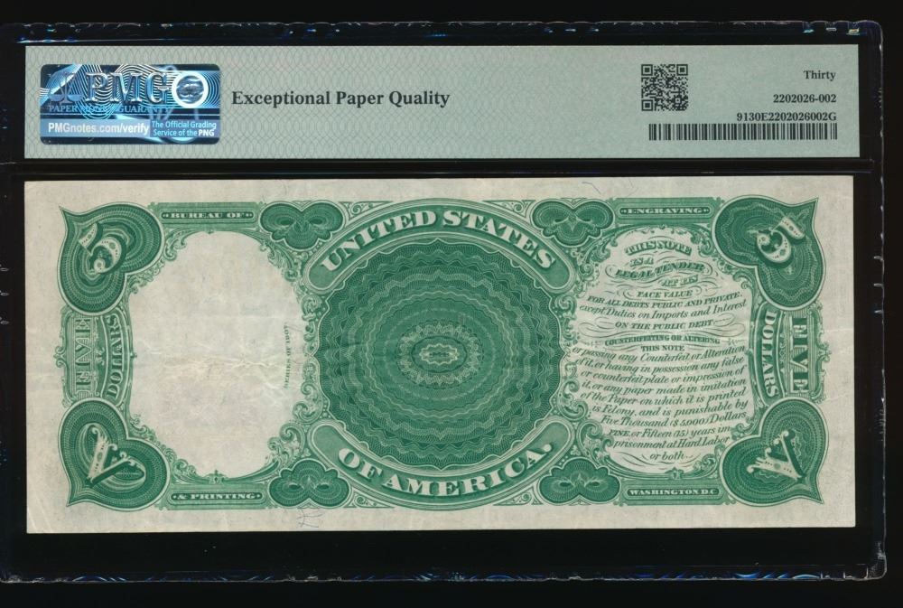 One 1907 $5 Legal Tender Note PMG 30EPQ.