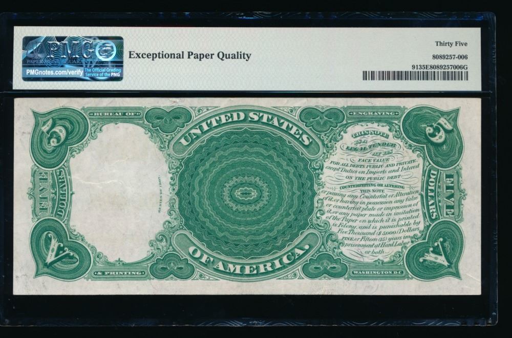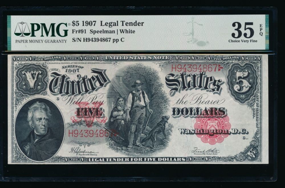 One 1907 $5 Legal Tender Note PMG 35EPQ.