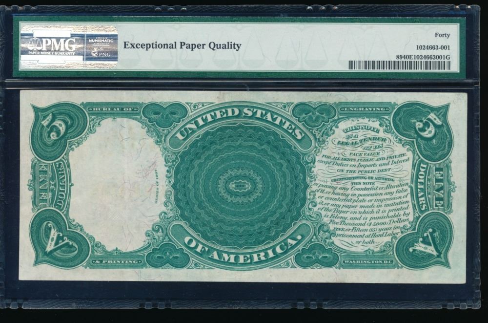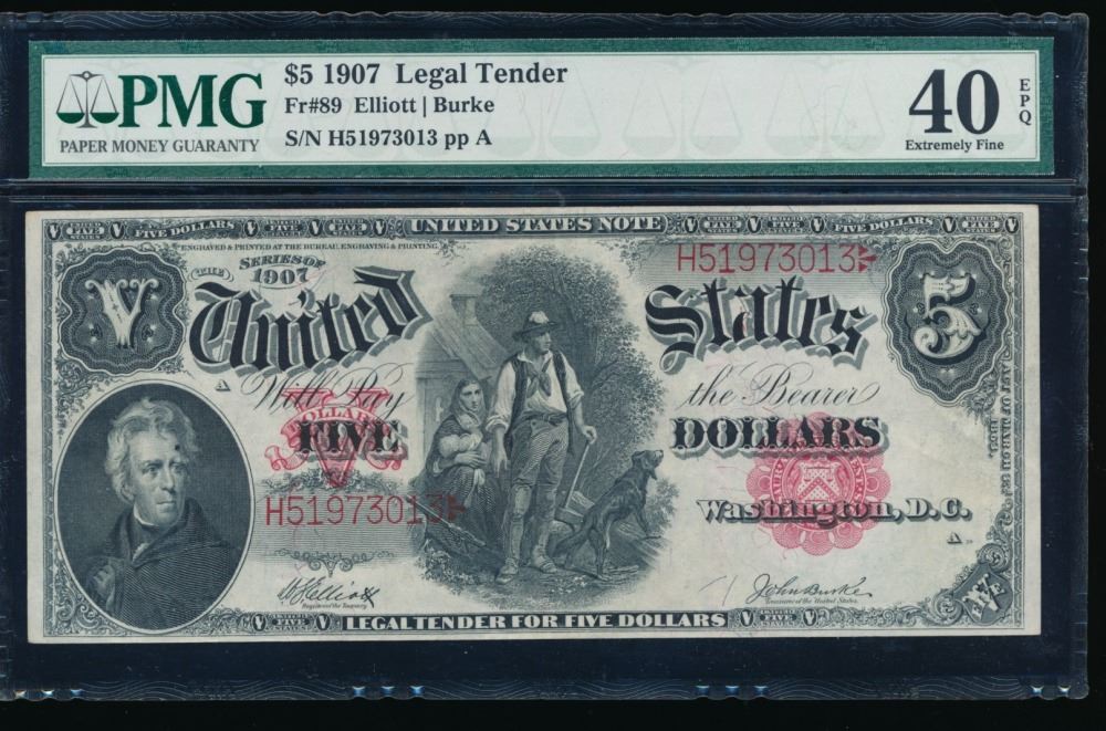 One 1907 $5 Legal Tender Note PMG 40EPQ.