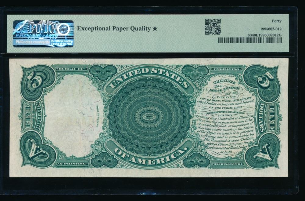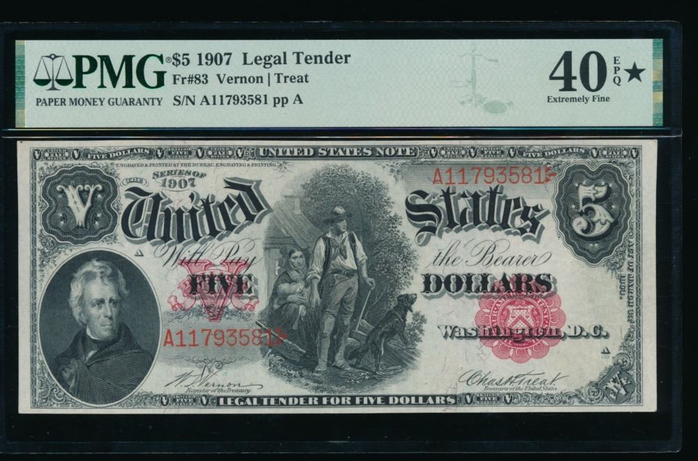 One 1907 $5 Legal Tender Note PMG 40EPQ.