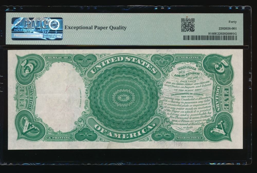 One 1907 $5 Legal Tender Note PMG 40EPQ.