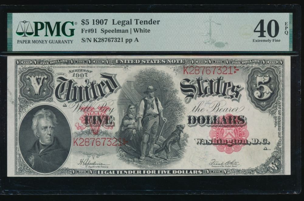 One 1907 $5 Legal Tender Note PMG 40EPQ.