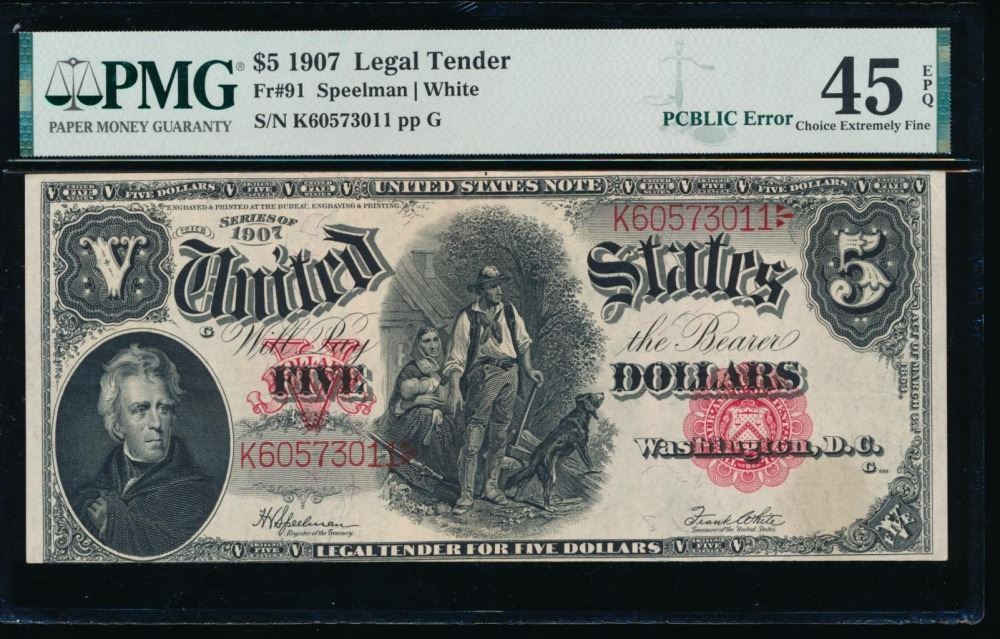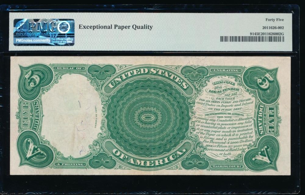 One 1907 $5 Legal Tender Note PMG 45EPQ.