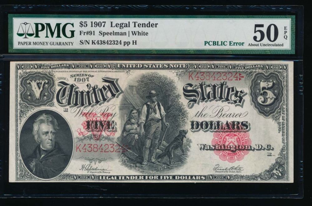One 1907 $5 Legal Tender Note PMG 50EPQ.