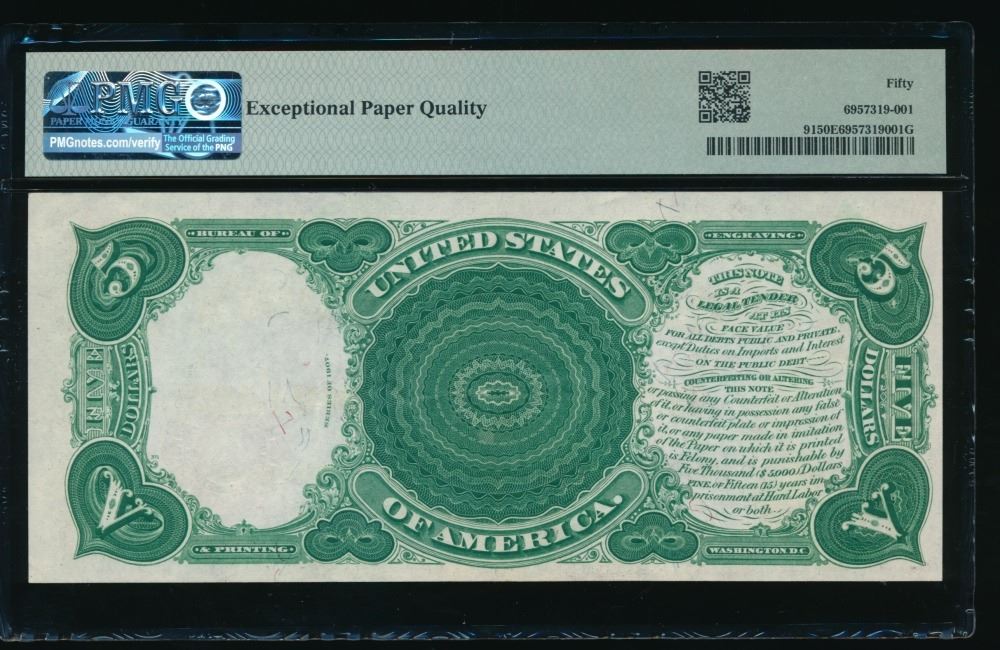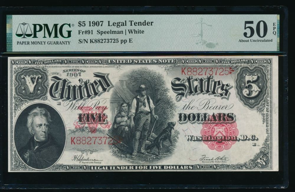 One 1907 $5 Legal Tender Note PMG 50EPQ.