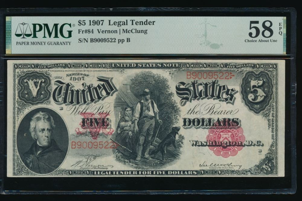 One 1907 $5 Legal Tender Note PMG 58EPQ.