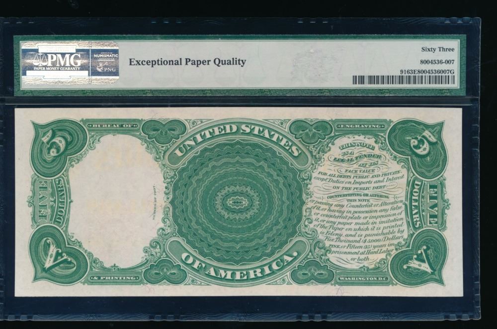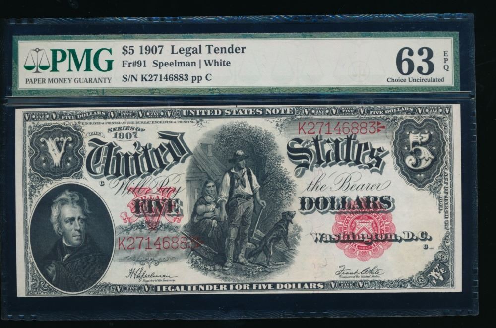 One 1907 $5 Legal Tender Note PMG 63EPQ.