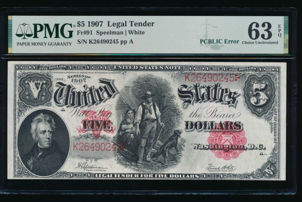 One 1907 $5 Legal Tender Note PMG 63EPQ.