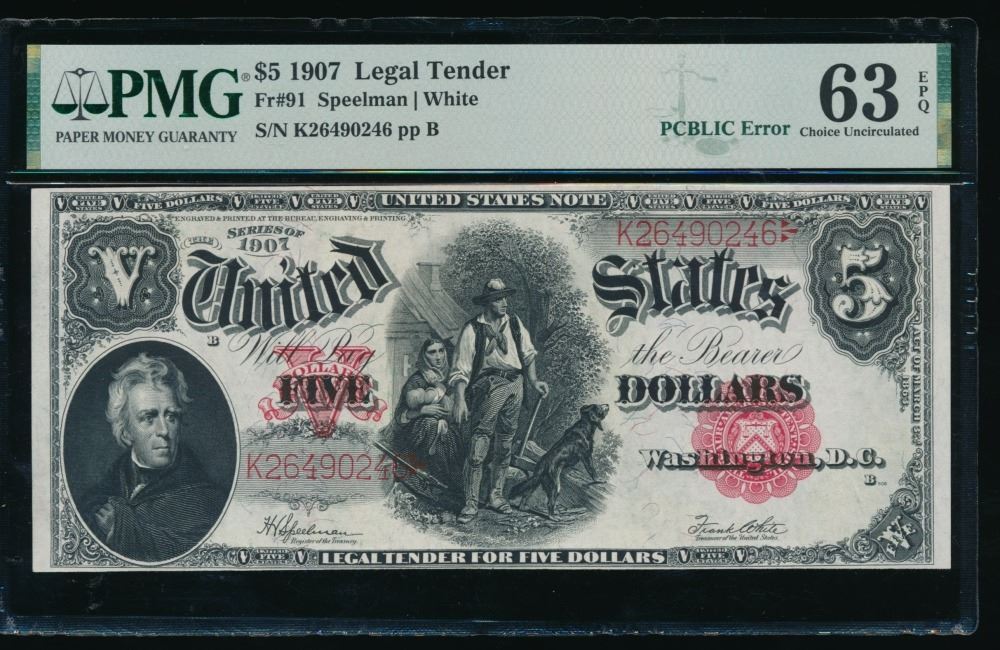One 1907 $5 Legal Tender Note PMG 63EPQ.