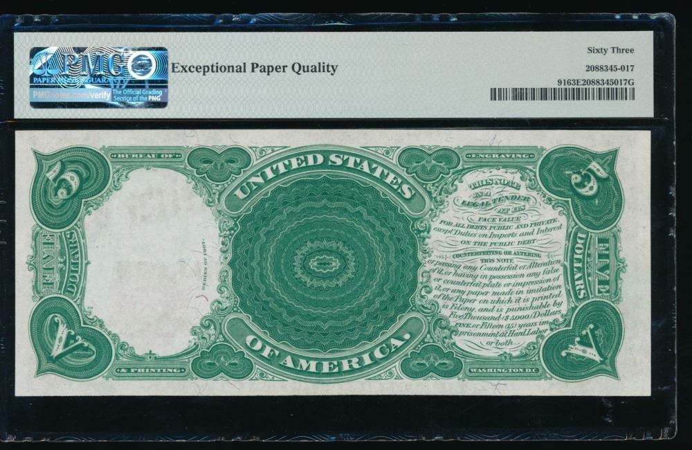 One 1907 $5 Legal Tender Note PMG 63EPQ.