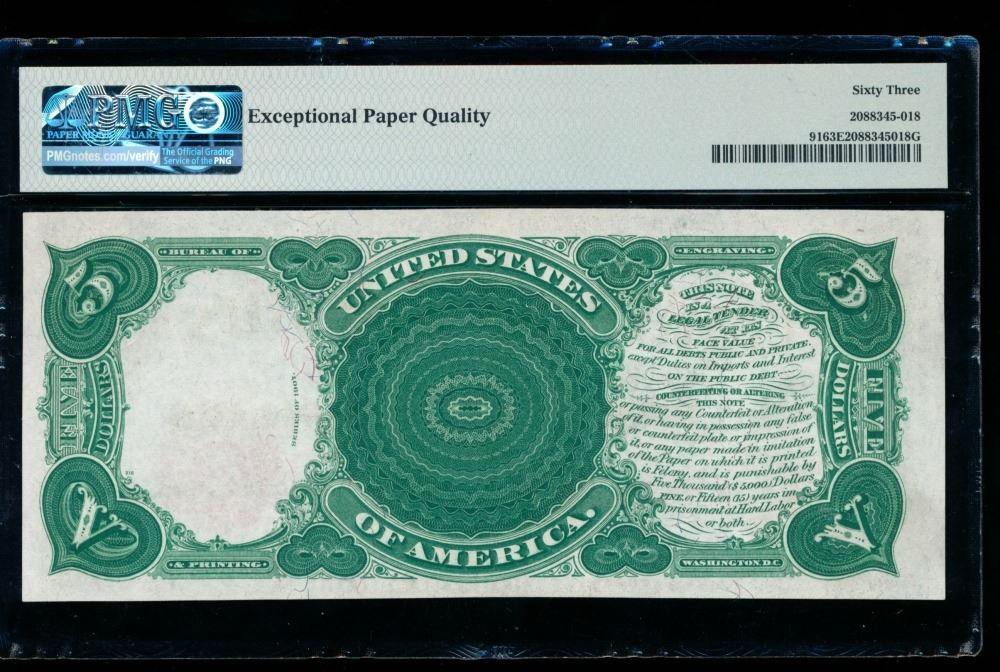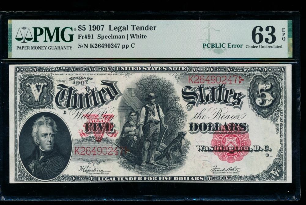 One 1907 $5 Legal Tender Note PMG 63EPQ.