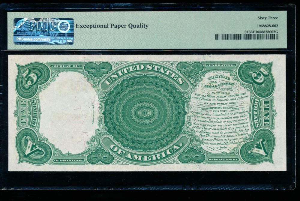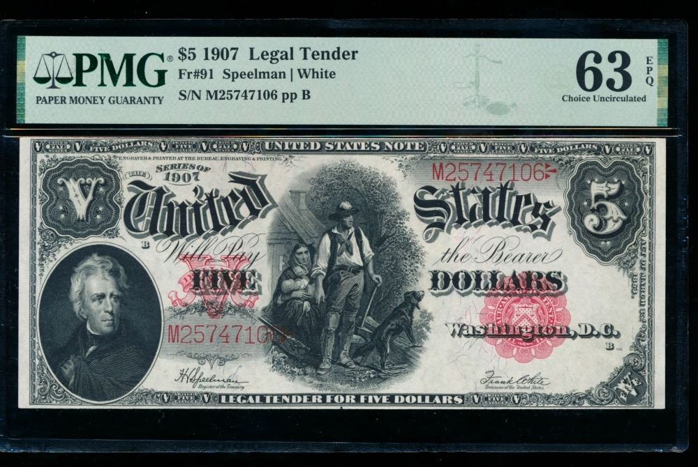 One 1907 $5 Legal Tender Note PMG 63EPQ.