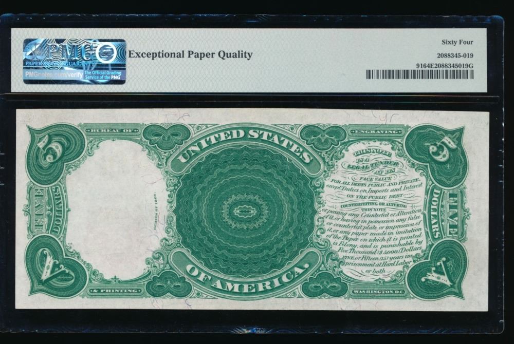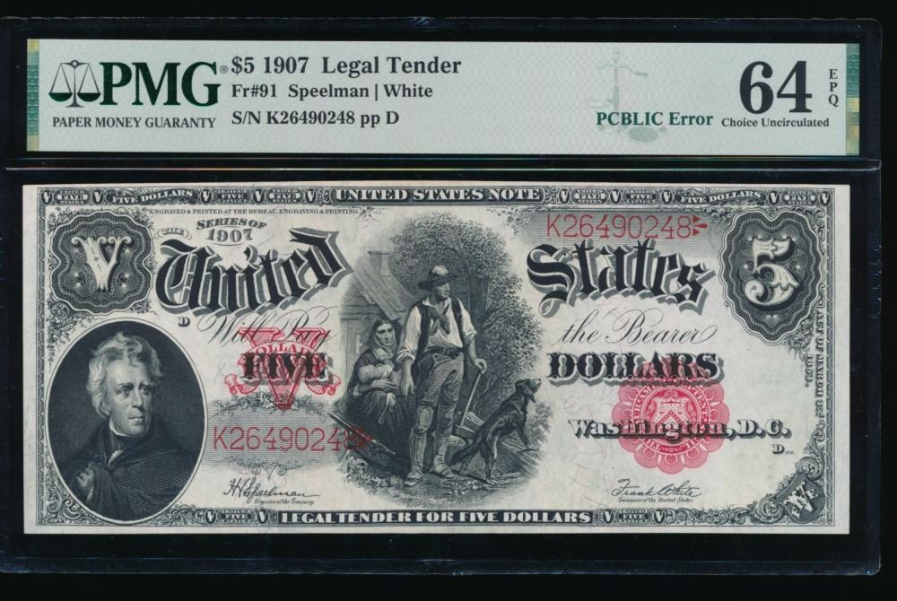 One 1907 $5 Legal Tender Note PMG 64EPQ.