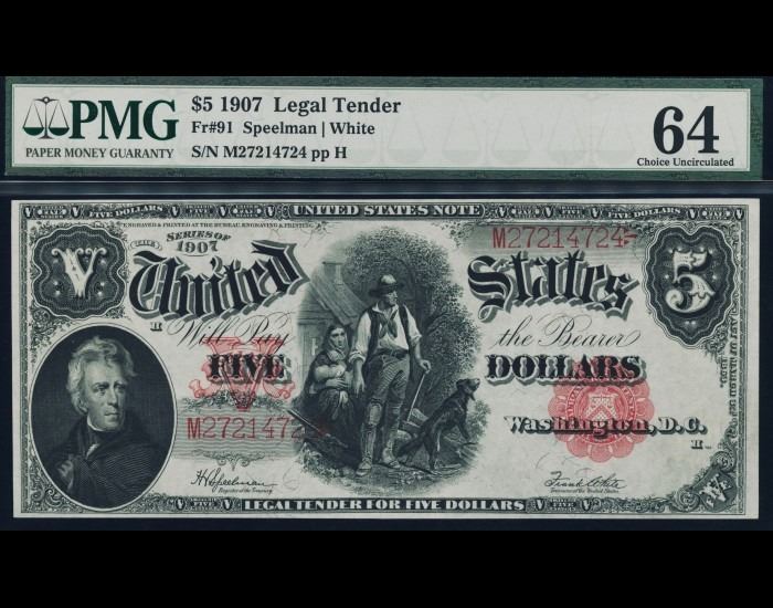 One 1907 $5 Legal Tender Note PMG 64.
