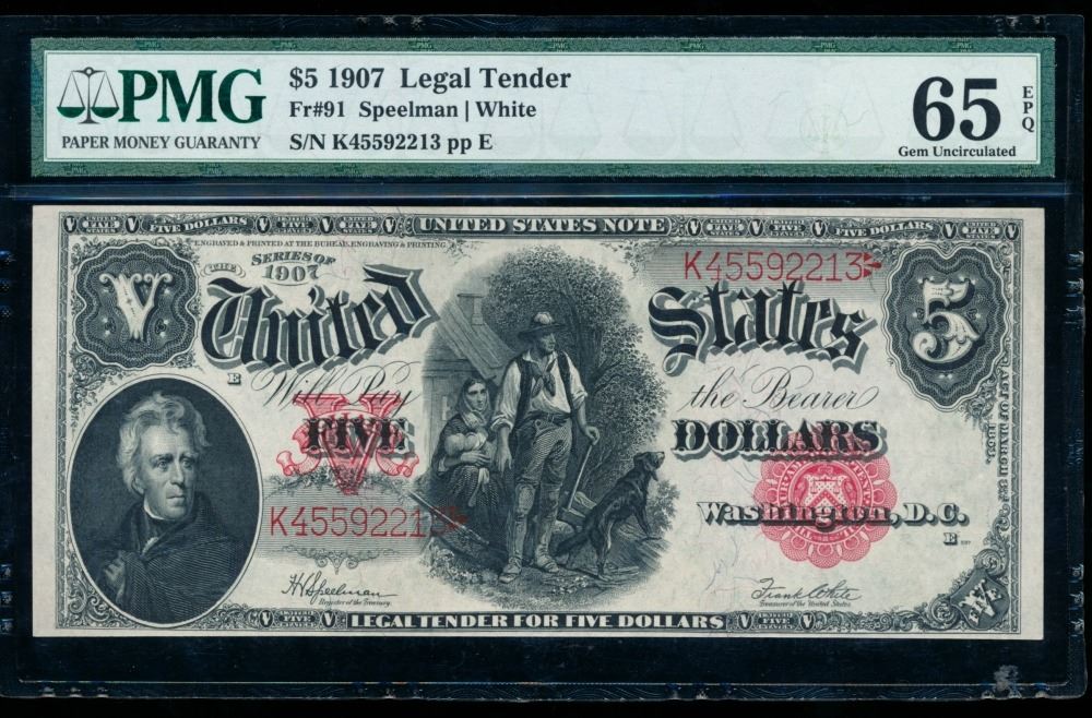 One 1907 $5 Legal Tender Note PMG 65EPQ.