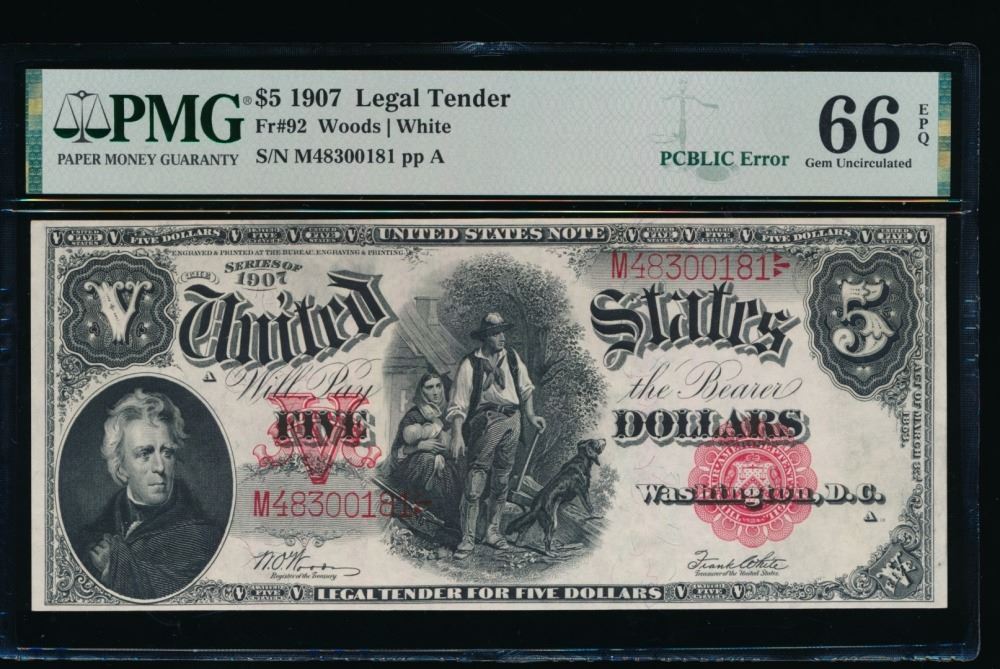 One 1907 $5 Legal Tender Note PMG 66EPQ.