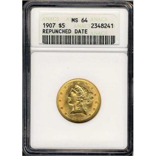 <b>1907 $5 Liberty. ANACS graded Repunched date. MS64.</b> Last of the Liberty head fives. Glittering rivers of flame-colored mint frost from center to periphery. Not to go overboard, but there is a wealth of detail seen throughout this well struck specimen <b>(PCGS # 8416)</b>
