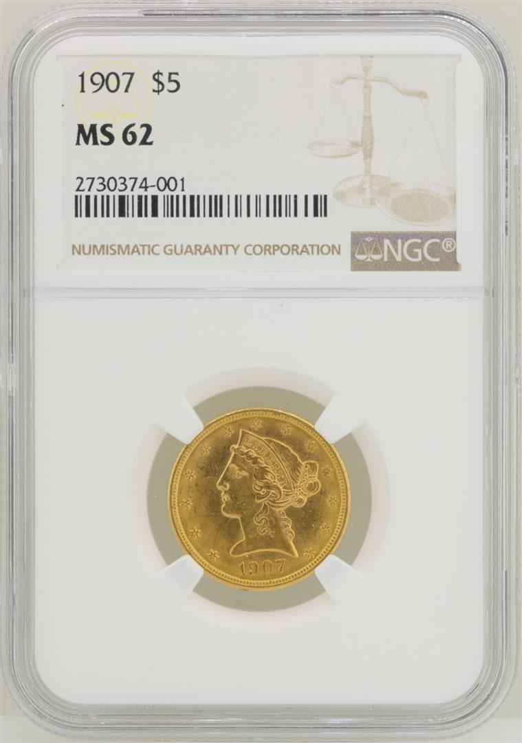 One 1907 $5 Liberty Head Half Eagle Gold Coin NGC MS62. NGC Certified.