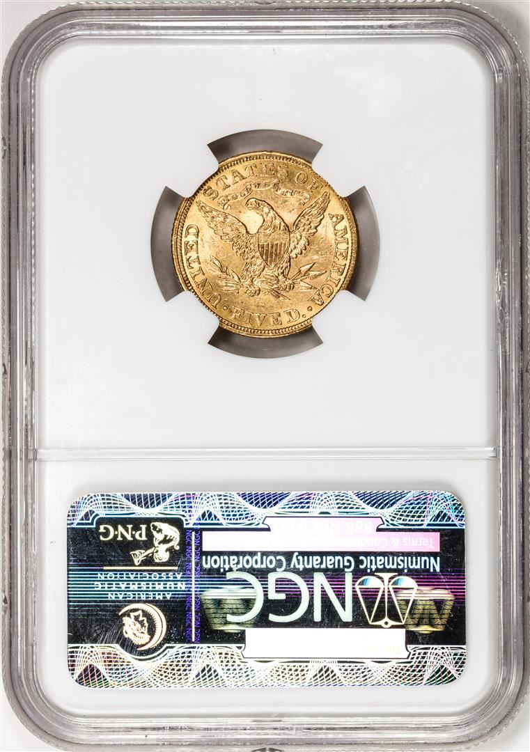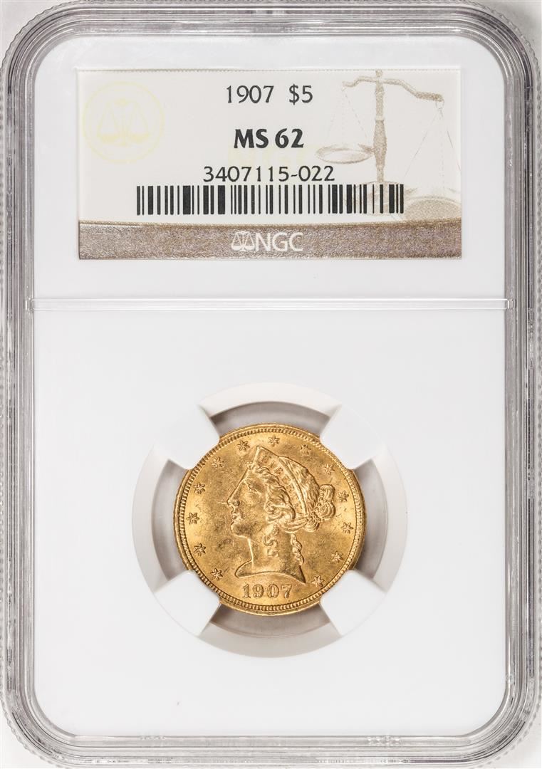 One 1907 $5 Liberty Head Half Eagle Gold Coin NGC MS62. NGC Certified.