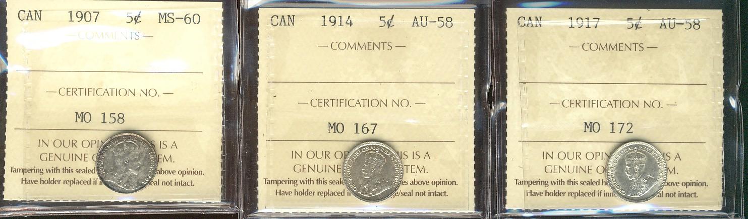 1907 5¢ MS60, 1914 & 1917 AU58. Lot of 3 ICCS graded coins.